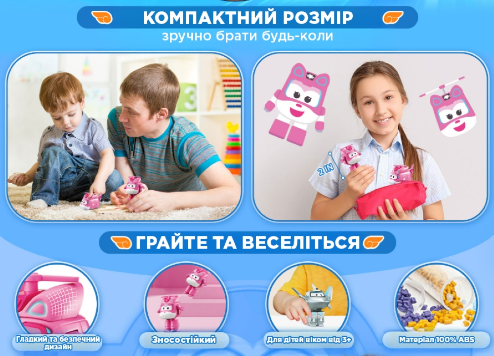 Super Wings — загін відважних літаків із навчального мультфільму Super Wings. Для дітей вони справжні друзі, які прийдуть на допомогу, коли б вони не знадобилися! Якщо ви хочете ознайомити дитину з географією, культурою, традиціями та мовами різних країн, то герої Super Wings — ваші найкращі помічники.