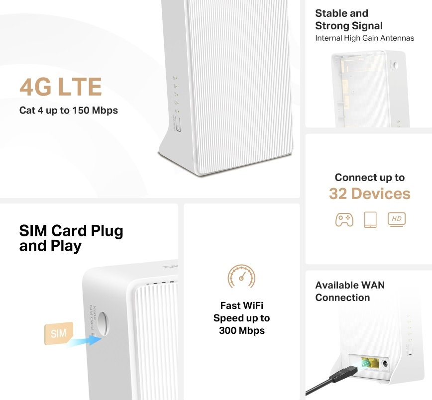 Повністю сумісний з FDD-LTE і TDD-LTE для роботи з більшістю постачальників послуг по всьому світу. Вставте SIM-карту nano і увімкніть маршрутизатор, щоб поділитися мережею 4G LTE з кількома пристроями Wi-Fi.