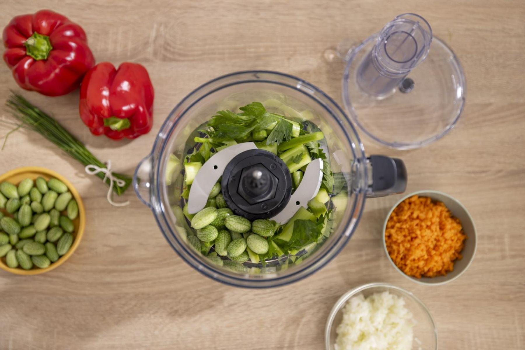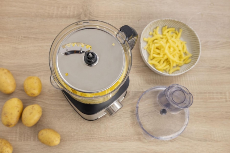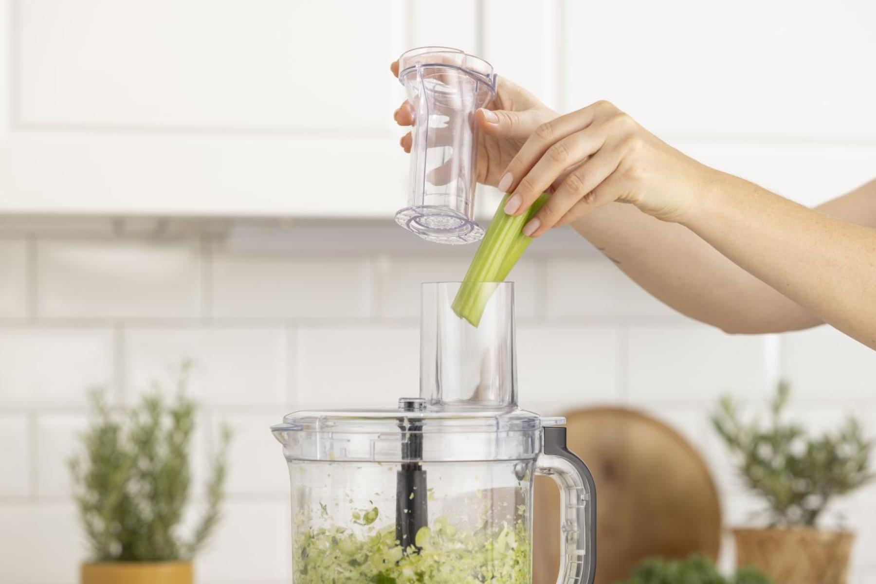 Комплектація створена як Total Food Prep Solution: чаша 2,0 л для замішування та збивання, глечик блендера 1,75 л (із 6-точковим ножем) і спортивний шейкер 700 мл для напоїв «із собою». У наборі — подвійний універсальний ніж із нержавіючої сталі для рубання/змішування/пюре, пластикова насадка для тіста, насадка для збивання білків, соковидавлювач для цитрусових і набір різальних дисків (нарізання скибками, шаткування, натирання — у т. ч. дрібне).