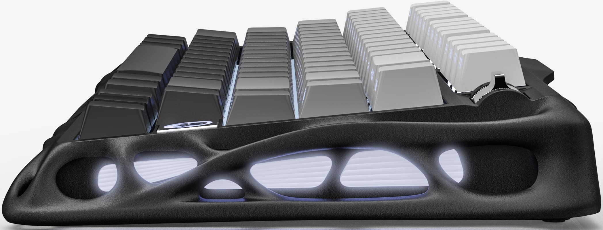 Будьте готові до всього з новою еволюцією дизайнерського клану K1. Неземні каталізатори переробили живий метал, згустивши і сконденсувавши його в обтічну форму, яка як і раніше світиться своїм внутрішнім сяйвом. Рекурсивні металеві гілки обтікають ряди виготовлених на замовлення перемикачів Kailh Linear, готових до роботи і ідеально збалансованих для будь-якого майбутнього виклику.