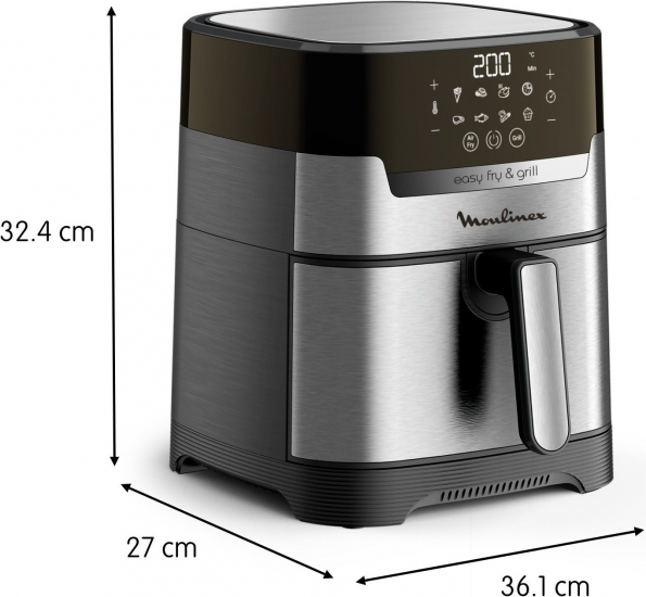 Мультипіч Moulinex EasyFry&Grill Digital з потужністю 1550 Вт та чашею 4,2 л забезпечує приготування на 6 порцій. Технологія Extra Crisp з циркуляцією потоків гарячого повітря та робочою температурою 80-200 °C. Сенсорне керування з 8 автоматичними програмами: картопля фрі, курка, нагетси, риба, м'ясо, піца, овочі, десерт, плюс 2 ручних режими аерофритюр та гриль.