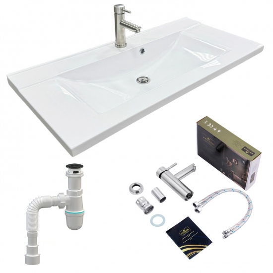 Головна - Побутова техніка, інструменти та товари для дому - Сантехніка - Раковини - Adamant - Набір для ванної кімнати, раковина, умивальник QUANTO 100, штучний камінь, прямокут., з сифоном Click-Clack + змішувач