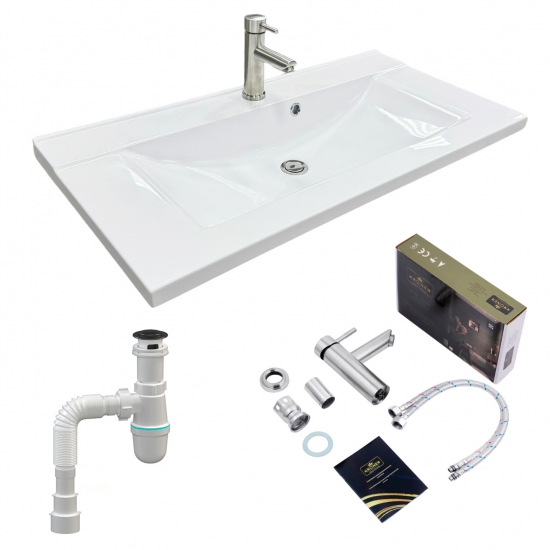 Головна - Побутова техніка, інструменти та товари для дому - Сантехніка - Раковини - Adamant - Набір для ванної кімнати, раковина, умивальник QUANTO 90, штучний камінь, прямокут., з сифоном Click-Clack + змішувач
