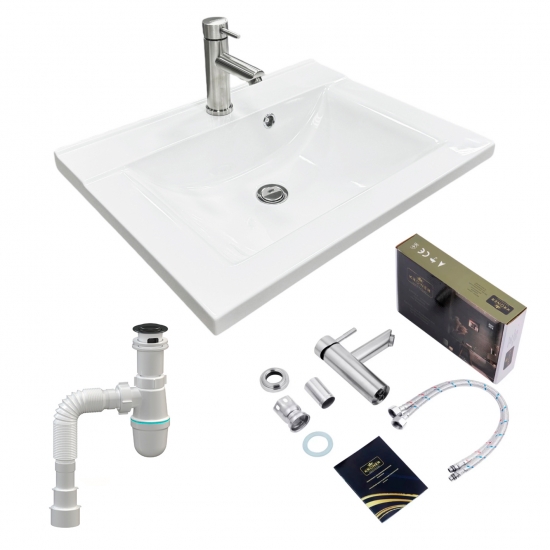 Головна - Побутова техніка, інструменти та товари для дому - Сантехніка - Раковини - Adamant - Набір для ванної кімнати, раковина, умивальник QUANTO 60, штучний камінь, прямокут., з сифоном Click-Clack + змішувач