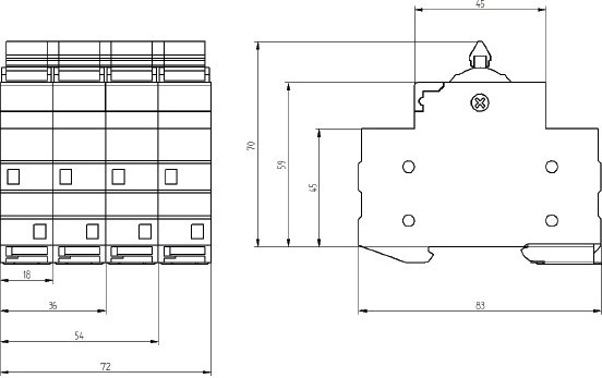 Номінальний струм 63 А, напруга 500 В AC, короткочасна витривалість струму 4.5 кА (1 с). Робоча температура -25°C до +80°C, ступінь захисту IP20. Сумісний з модульними автоматами та пристроями для захисту від перевантажень.