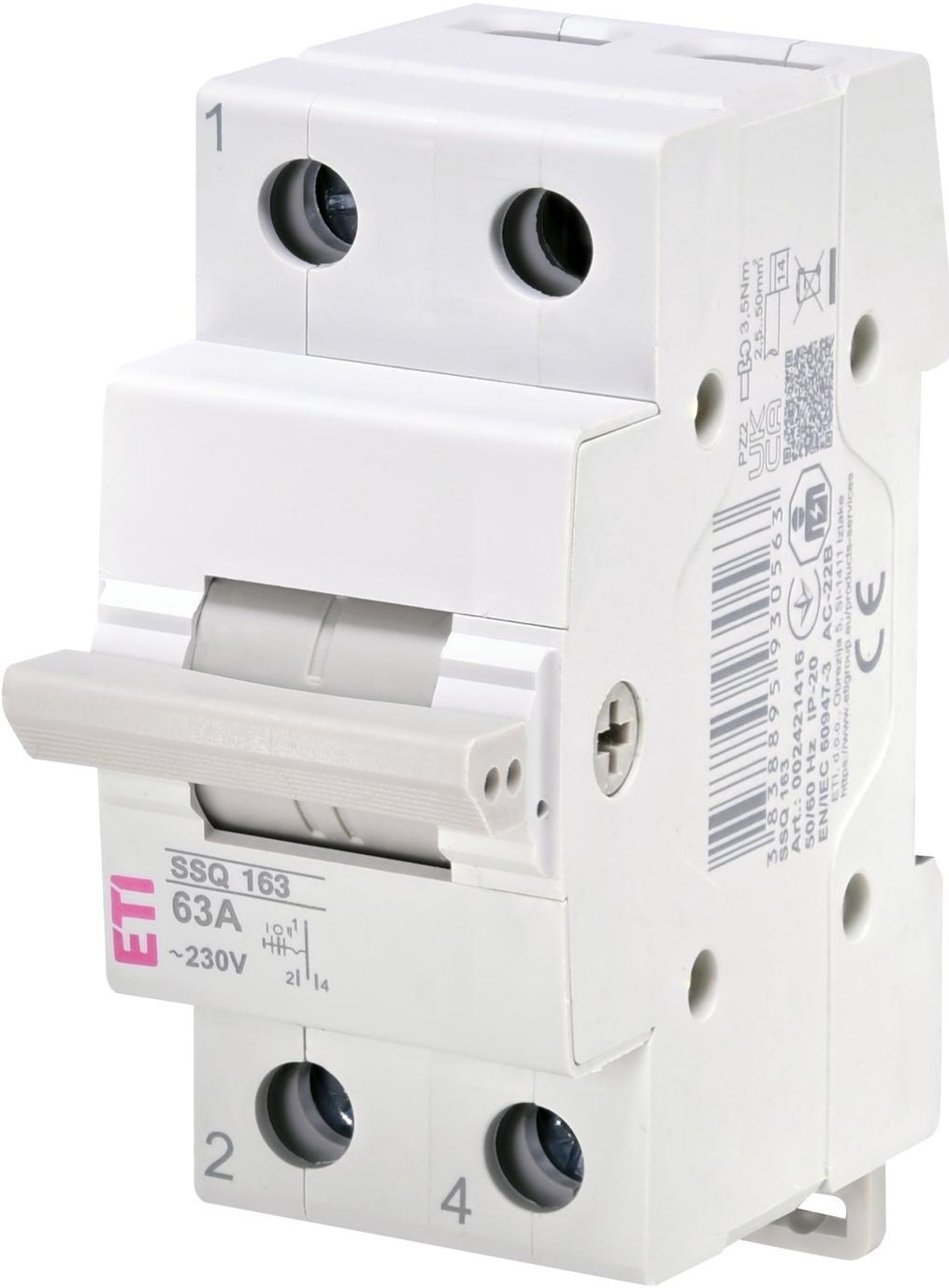 Модульний дизайн займає 1.5 модуля (27 мм ширини), встановлюється на DIN-рейку в щитках. Корпус із високоякісного пластику стійкий до механічних навантажень, з ергономічним важелем для легкого керування. Серія SSQ від словенського виробника ETI (понад 70 років досвіду) гарантує надійність і сумісність з європейськими стандартами.