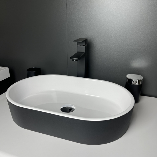 Раковина, умивальник Adamant BESTE NEW, штучний камінь, овальна, без отвору для змішувача та переливу, 540x350x11мм, накладний, чорно-білий