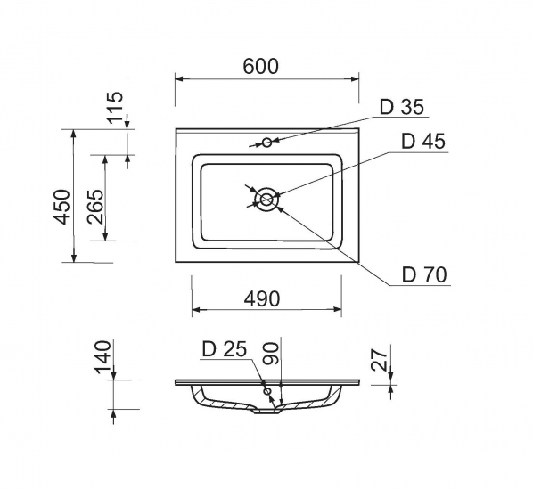 Раковина Adamant FLAT має прямокутну форму, виготовлена зі штучного каменю з розмірами 600 x 450 x 140 мм та білим кольором. Накладний тип встановлення з отворами для змішувача та переливу дозволяє монтаж на тумбу. Матеріал створений за технологією Solid Surface, стійкий до впливу та довговічний.