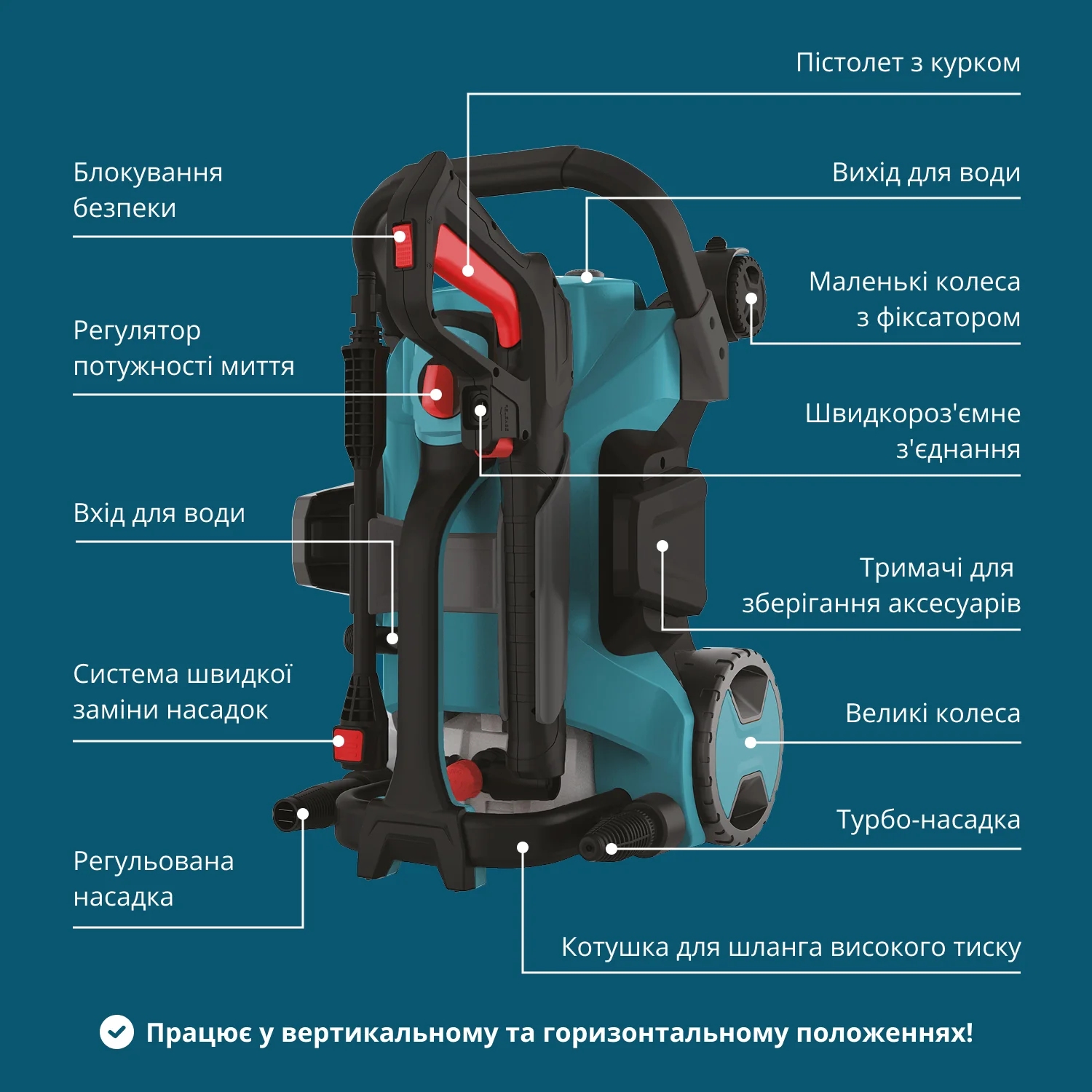 • Швидкороз’ємні з’єднання (quick-connect) — швидке підключення шлангів і насадок