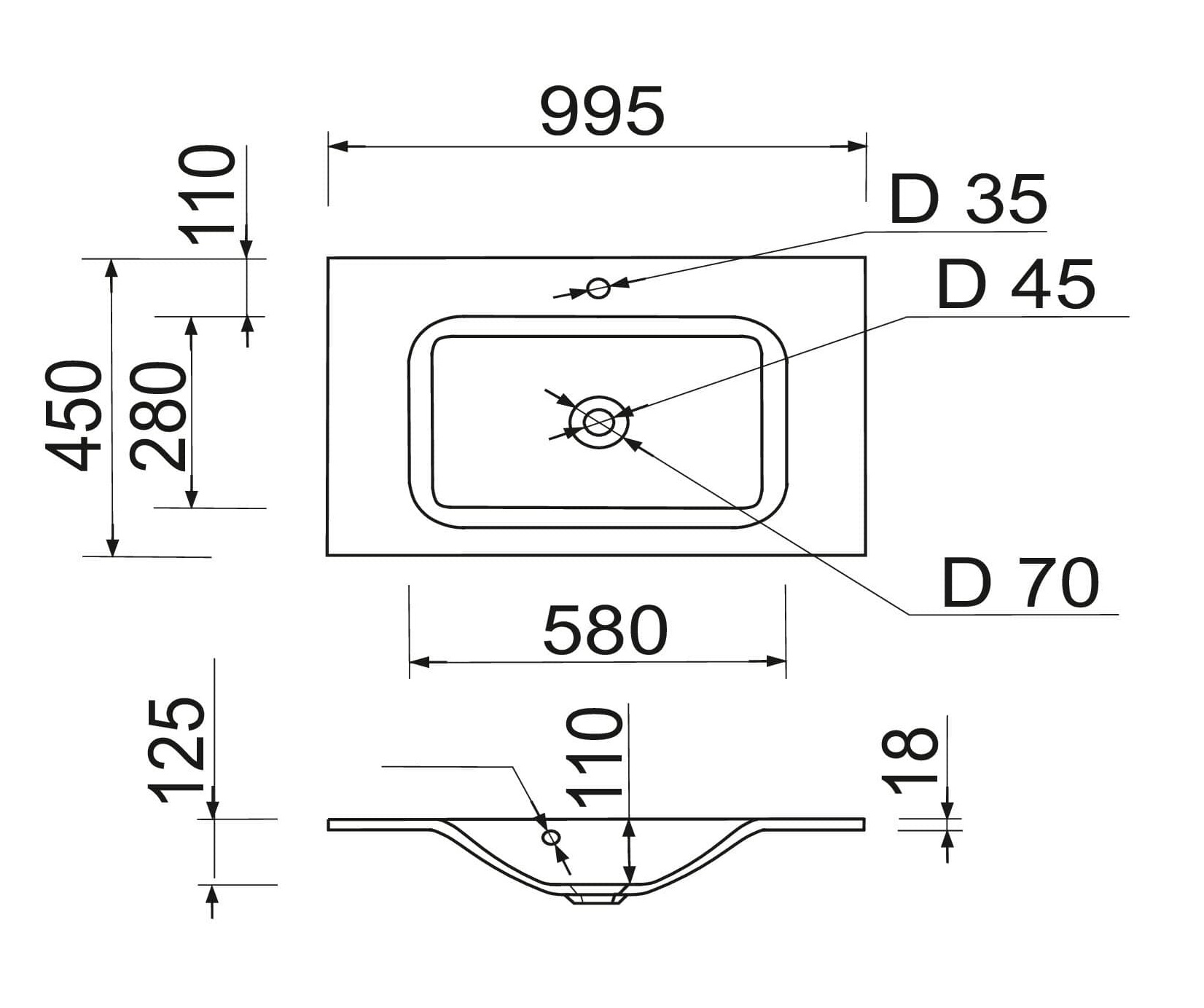 Раковина Adamant FRATE пропонує накладний тип встановлення, прямокутну форму з отворами для змішувача та переливу. Розміри становлять 995 x 450 x 125 мм, колір – білий. Виріб призначений для монтажу на тумбу, створено в Україні.