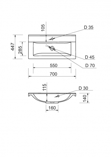 Опис Раковина, умивальник Adamant QUANTO, штучний камінь, прямокут., з отвором для змішувача, з отвором для переливу, 700х447х140мм, накладний, білий
