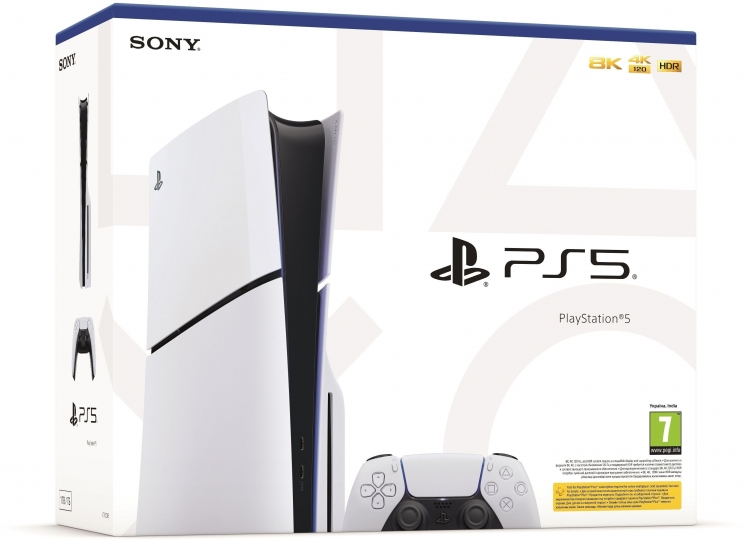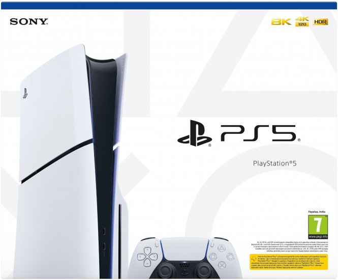 Ігрова консоль PlayStation 5 Slim Blu-ray представляє оновлену версію з пакуванням українською мовою та скандинавськими мовами. З дисковим приводом, консоль запускає ігри з цифрового магазину PlayStation Store та з дисків. Оснащена 8-ядерним 16-потоковим процесором AMD Zen 2, графічним чипом RDNA 2 з 36 обчислювальними блоками до 2,23 ГГц. Накопичувач SSD об'ємом 1 ТБ з швидкістю 5,5 ГБ/с, пам'ять GDDR6 18 ГБ з пропускною здатністю 448 ГБ/с. Підтримка променевого відстеження та 3D звуку для геймплею.