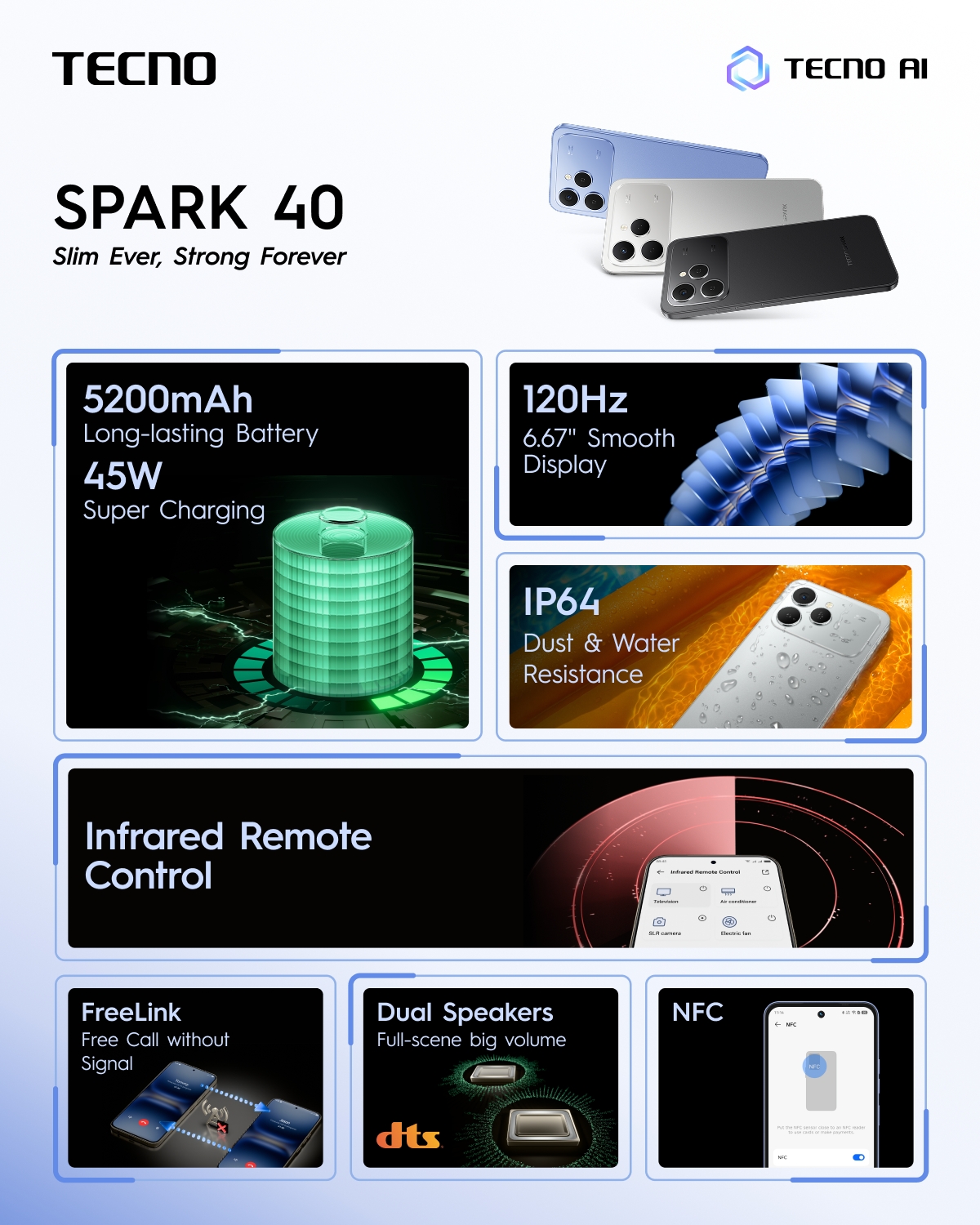 Смартфон TECNO Spark 40 (KM5n) має дисплей IPS діагоналлю 6,67" з роздільною здатністю 1600x720 та частотою оновлення 120 Гц. Оснащений процесором MediaTek Helio G91 з 8 ГБ оперативної пам'яті та 256 ГБ вбудованої. Основна камера 50 Мп з подвійним спалахом, фронтальна 8 Мп. Акумулятор 5200 мА·год з зарядкою 45 Вт, розміри 165,6 x 77 x 7,7 мм, вага 191 г.
