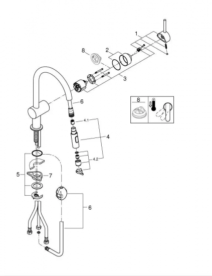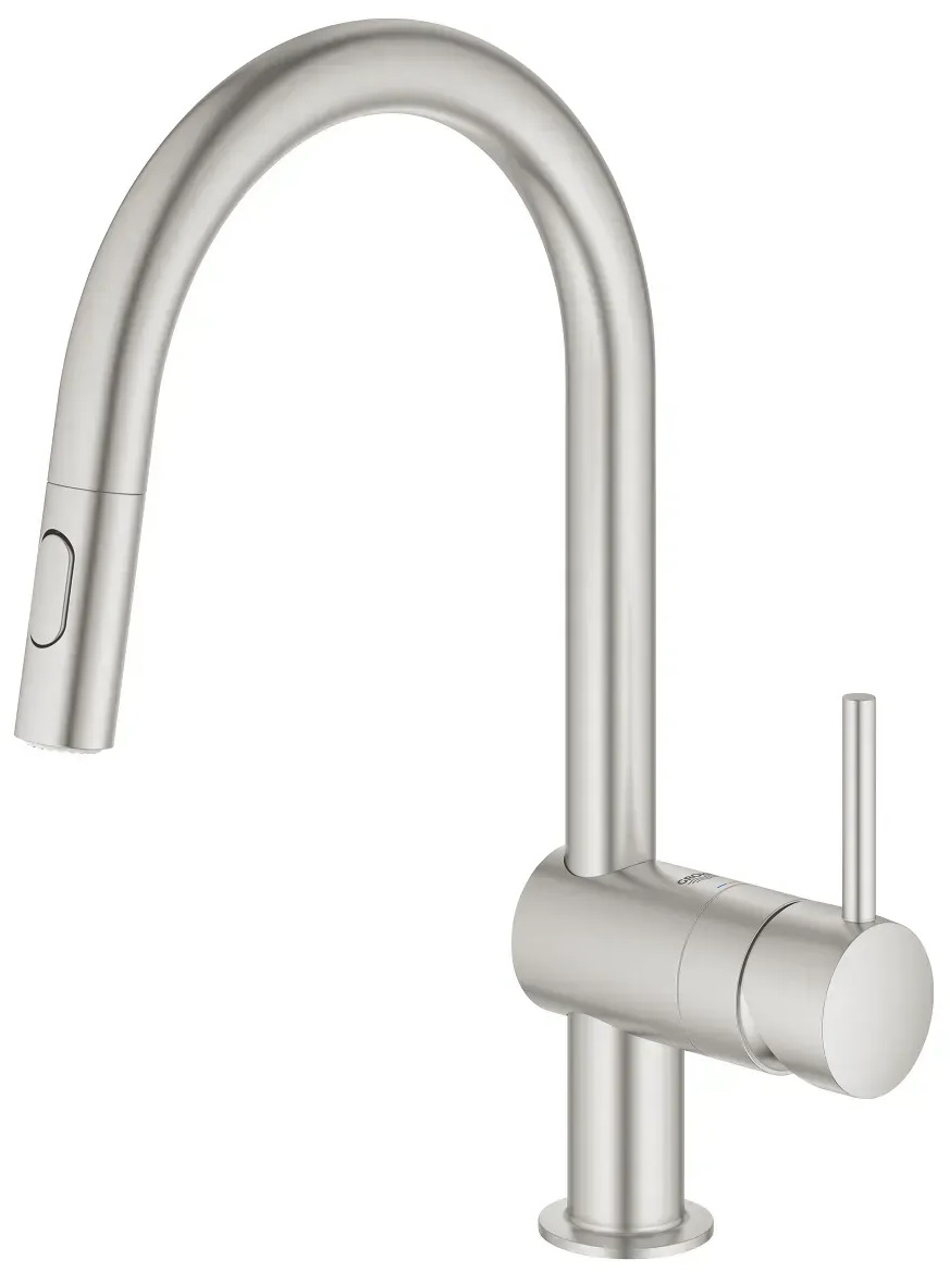 Опис Змішувач для кухні Grohe Minta, довж.виливу - 223мм, поворотний/витяжний, 1 важіль, суперсталь