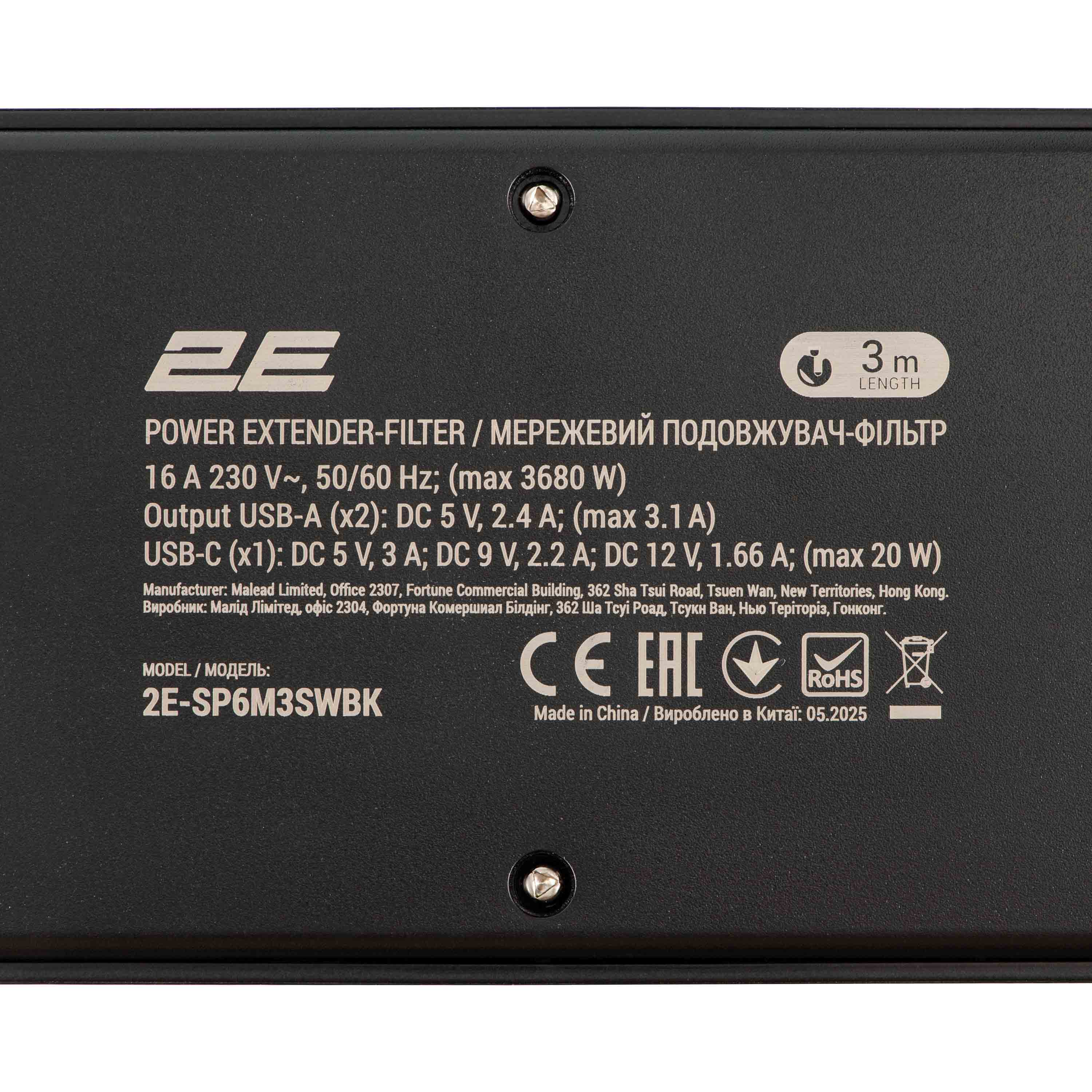 Подовжувач мережевий 2E 3м, 6xТипF, 16A, 2xUSB-A, 1x USB-C фільтр, чорний