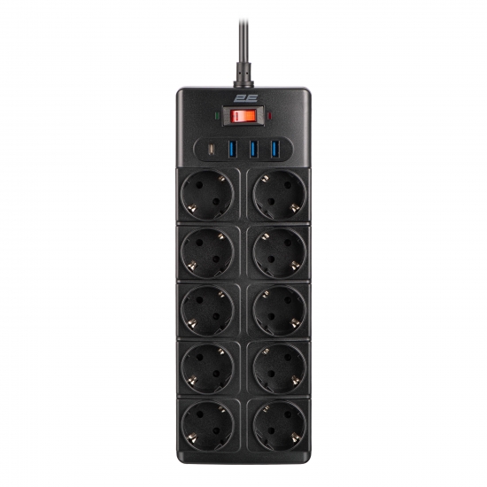 Опис Подовжувач мережевий 2E 3м, 10xТипF, 16A, 3xUSB-A, 1xUSB-C, фільтр, чорний