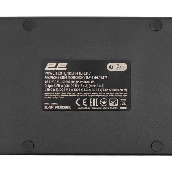 Головна - Продукція та рішення для підприємств - Електротовари та світло - Мережеві фільтри - 2E - Подовжувач-фільтр мережевий 2E 10xТип F, 3x1.5мм кв, 16A, з захистом від перенапруги, 3xUSB-A, 1xUSB-C, 3м, чорний