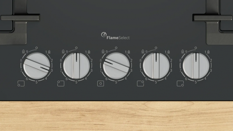 Газова варильна поверхня Bosch PPQ7A6I45 на чорному загартованому склі шириною 75 см підтримує монтаж врівень або накладний. FlameSelect забезпечує дев’ять відтворюваних рівнів полум’я, а автозапалювання в ручках спрощує запуск. Центральна WOK-конфорка до 4 кВт додає потужності для смаження та великого посуду, решта конфорок покривають щоденні задачі. Термоелектричний захист перекриває газ у разі згасання, чавунні решітки придатні для миття в посудомийній машині.