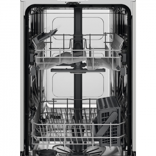 Посудомийна машина Electrolux шириною 45 см з інверторним двигуном і системою сушіння AirDry. Подвійні розпилювачі у верхньому та нижньому кошиках подають воду в кожен куток. Є п’ять програм і три температури, включно зі швидкою 30-хвилинною програмою та режимом «Полоскання і очікування». Просте встановлення: стандартні підключення, регульовані ніжки.