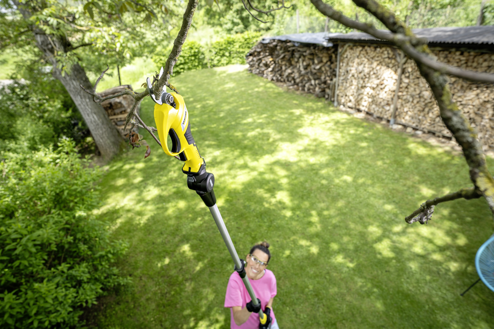 Телескопічний подовжувач Kärcher PGS 4-18 (2.445-247.0) має регульовану довжину від 145 до 205 см для безпечного доступу до високих гілок. Кут повороту 135° дозволяє точно спрямовувати інструмент під час обрізки. Сумісність з акумуляторною шабельною пилою PGS 4-18 та сучкорізом TLO 2-18 забезпечує швидке кріплення без додаткових інструментів. Алюмінієвий корпус вагою 1,8 кг полегшує маневрування, а гумові накладки запобігають ковзанню. Цей аксесуар створює безпечні умови для садових робіт.