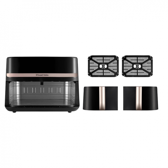 Russell Hobbs 27680-56 — це мультипіч із двома незалежними кошиками по 4,5 л, що забезпечують гнучкість приготування. Завдяки сенсорному управлінню можна синхронізувати обидві зони або дублювати налаштування, щоб отримати однакові результати. Технологія циркуляції гарячого повітря гарантує хрустку скоринку без олії, а стильне чорне оформлення з акцентами «шампань» робить прилад окрасою кухні.