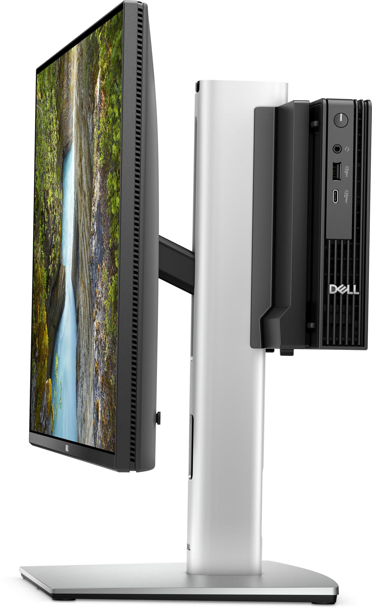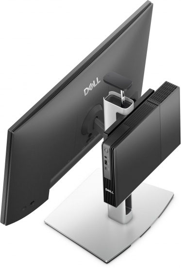 Dell Pro Micro All-in-One Stand MFS22 допомагає організувати простір на робочому столі й забезпечує зручне розташування монітора. Система Dell Quick Release дозволяє швидко встановити або зняти екран без додаткових інструментів. Телескопічна ручка спрощує переміщення підставки разом із монітором. Елегантна конструкція має приховане прокладання кабелів і займає мінімум місця. Передбачено регулювання висоти до 150 мм, нахил від -5° до +21° та поворот від -90° до +90°. Вбудовані опції для навісних замків і слот Kensington допомагають надійно закріпити монітор і систему Dell Pro Micro.