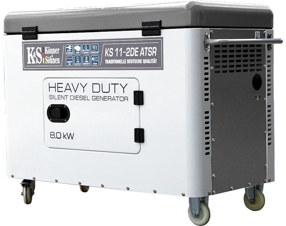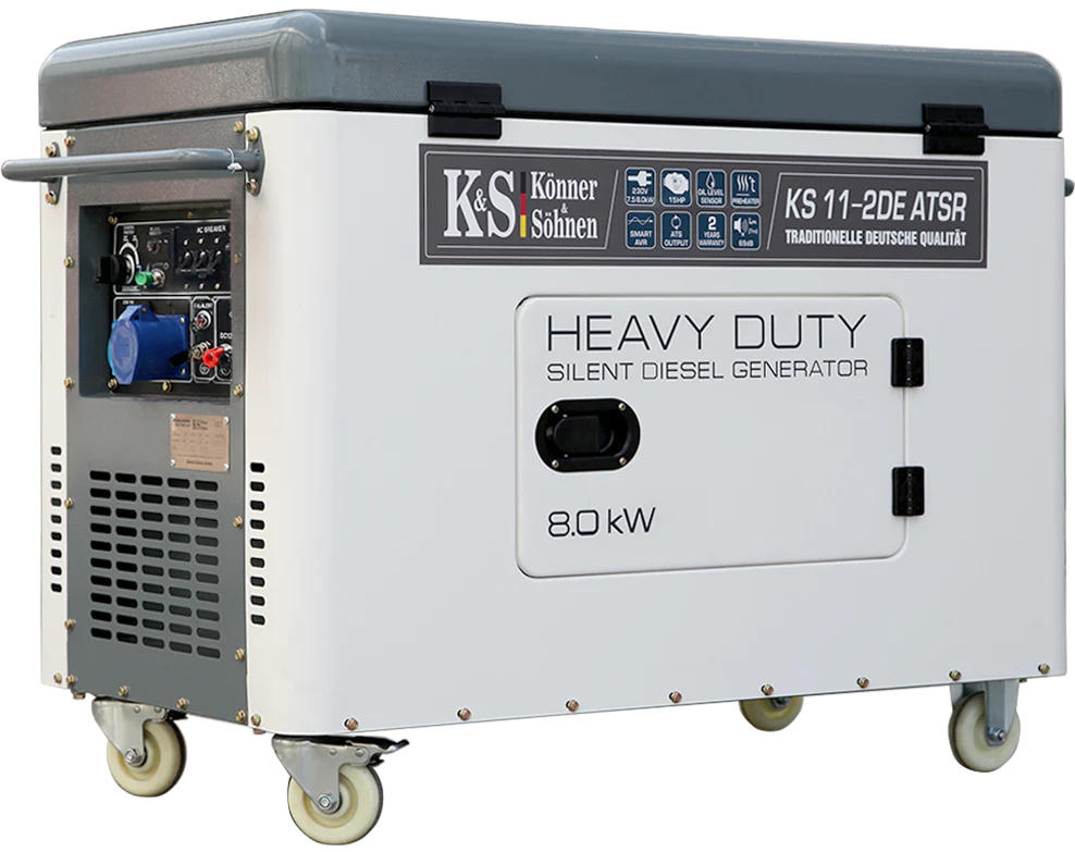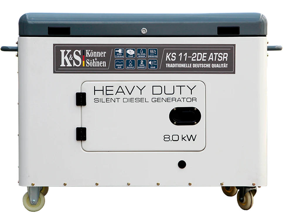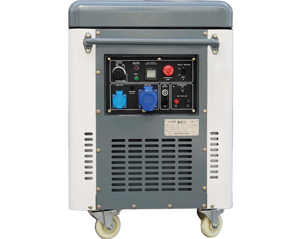 Генератор Konner&Sohnen KS 11-2DE ATSR — це потужний дизельний агрегат професійного рівня, розроблений для стабільного енергопостачання будівель, офісів, виробничих і приватних об’єктів. Оснащений зручним електростартером, системою передстартового підігріву та роз’ємом для підключення АВР, генератор готовий до автоматичної роботи в системах резервного живлення. Ергономічна панель керування з LED-дисплеєм дозволяє контролювати частоту, напругу та мотогодини, а антивандальний шумопоглинаючий кожух гарантує захист і знижений рівень шуму.