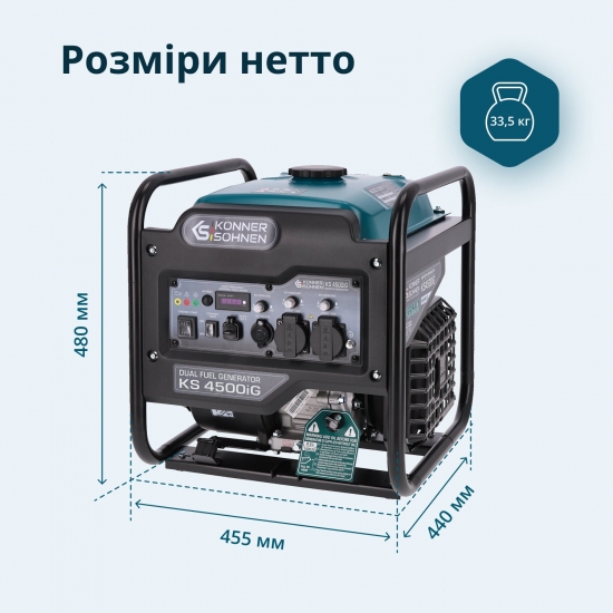 Технічні характеристики Генератор газобензиновий інверторний Konner&Sohnen KS 4500iG, 230В, 4.5кВт, ручний стартер, 33.5кг: