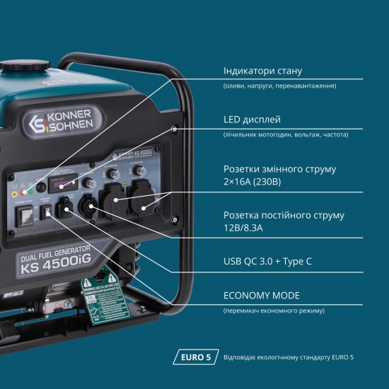 Генератор газобензиновий інверторний Konner&Sohnen KS 4500iG, 230В, 4.5кВт, ручний стартер, 33.5кг