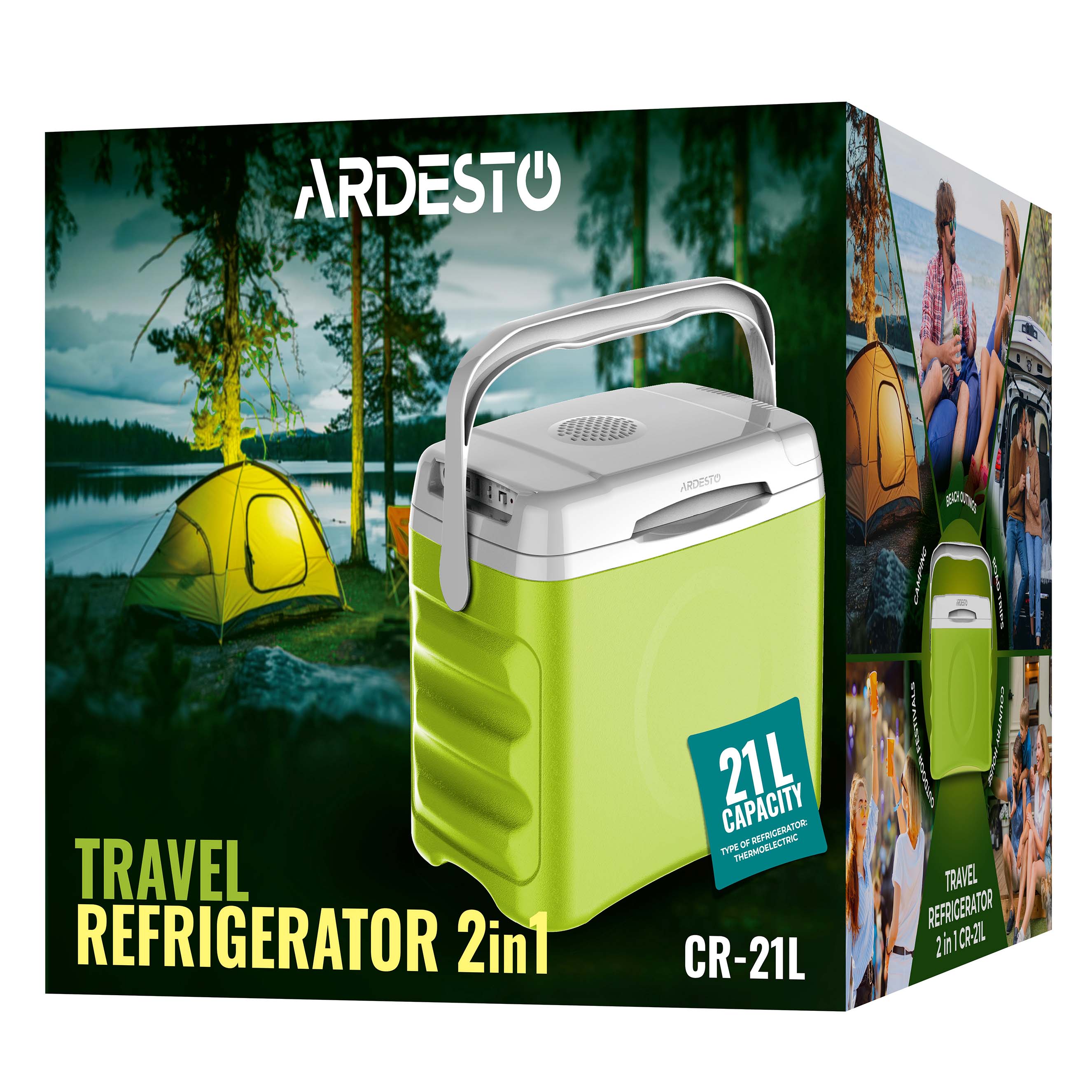 Дорожній холодильник ARDESTO CB-21L – це не просто охолоджувач, а мобільний термобокс 2 в 1, який може підтримувати і прохолоду, і тепло. Завдяки елементу Пельтьє модель забезпечує охолодження вмісту на 18–20 °C нижче температури довкілля або підігрівання до 55 °C, тому стане в пригоді як для літніх мандрівок, так і для зимових поїздок. Індикатори на корпусі відображають активний режим – «охолодження» або «нагрівання». Перемикання відбувається автоматично в разі зміни полярності, тому керування просте та інтуїтивне. Крім того, під час припинення електропостачання вдома холодильник може підтримувати потрібну температуру, працюючи від автомобіля чи зовнішнього акумулятора.