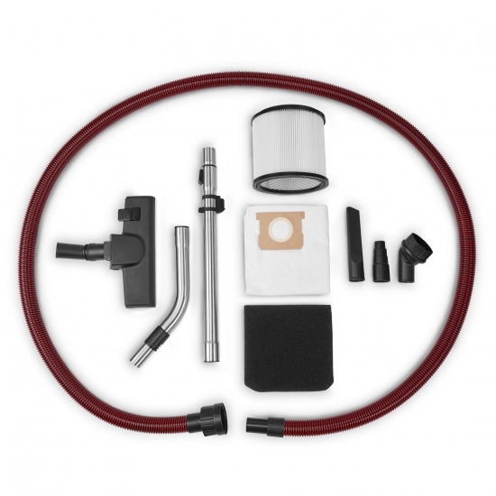 Для чистого повітря та безпечної роботи передбачено гофрований HEPA-фільтр, який затримує дрібнодисперсний пил, а також поролоновий фільтр для вологого прибирання та міцний синтетичний мішок для сухого сміття. Модель відповідає класу пилу L за європейською нормою, тож може ефективно та безпечно прибирати штукатурний пил, вапно, пісок, цемент і ґрунт — підходить як для майстерень, так і для будівельних майданчиків.