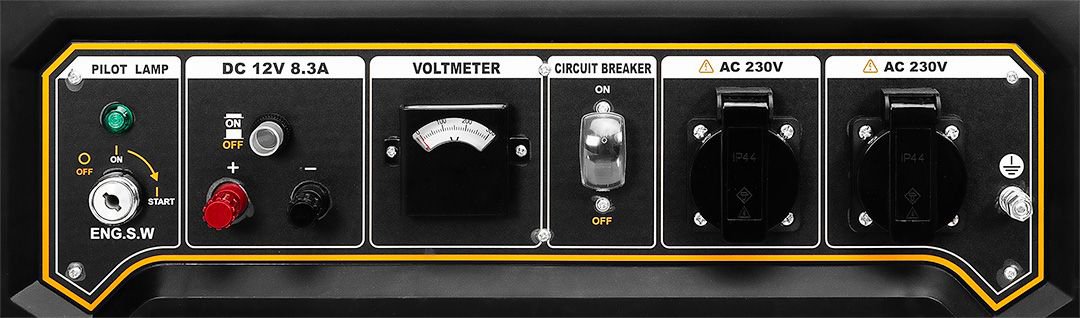 Міцна металева рама виконує захисну та транспортну функцію, а колеса та складні ручки полегшують переміщення. Генератор обладнаний двома розетками 230 В та виходом 12 В, вольтметром і паливним індикатором. Ємний бак на 15 л забезпечує тривалий час роботи без необхідності дозаправки, а рівень шуму 96 дБ відповідає стандартам Euro V.
