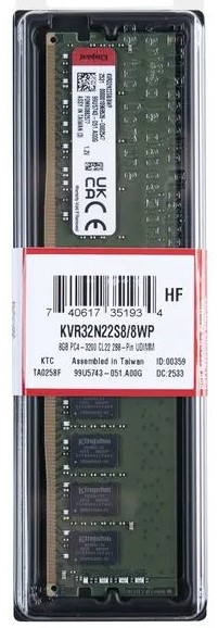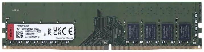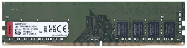 Модуль оперативної пам’яті Kingston DDR4 8 ГБ виконано у форм-факторі DIMM і оснащено 288-контактними позолоченими рознімами для надійного підключення. Архітектура на базі восьми 1G x 8-бітних компонентів FBGA забезпечує компактність та ефективну інтеграцію в комп'ютерні системи. Латентність CL22 з таймінгами 22-22-22 оптимізує швидкість обміну даними відповідно до стандарту JEDEC на частоті 3200 МГц. Висота плати 31,25 мм полегшує встановлення в стандартні корпуси, а наявність вбудованого EEPROM для виявлення присутності через I2C інтерфейс спрощує конфігурацію. Фіксований burst chop 4 та burst length 8 через набір регістрів режиму, з можливістю вибору BC4 чи BL8 на льоту, додають гнучкості в роботі. Однорангова структура з 16 внутрішніми банками, розділеними на 4 групи по 4 банки кожна, оптимізує доступ до даних. Модуль відповідає вимогам RoHS та не містить галогенів, що робить його екологічним вибором.