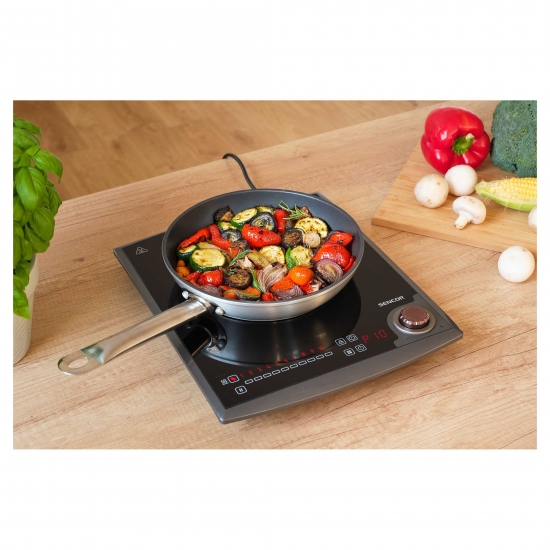 Sencor SCP 3414GY — індукційна настільна плита з однією конфоркою потужністю 2000 Вт. Сенсорні кнопки у поєднанні з поворотною ручкою забезпечують просте керування параметрами нагріву. Температурний діапазон від 60 до 240 °C дозволяє готувати різні види страв. Вбудований таймер допомагає встановлювати час приготування до трьох годин. Поверхня з гладкого скла легко очищується, а компактний корпус зручний для зберігання та транспортування.