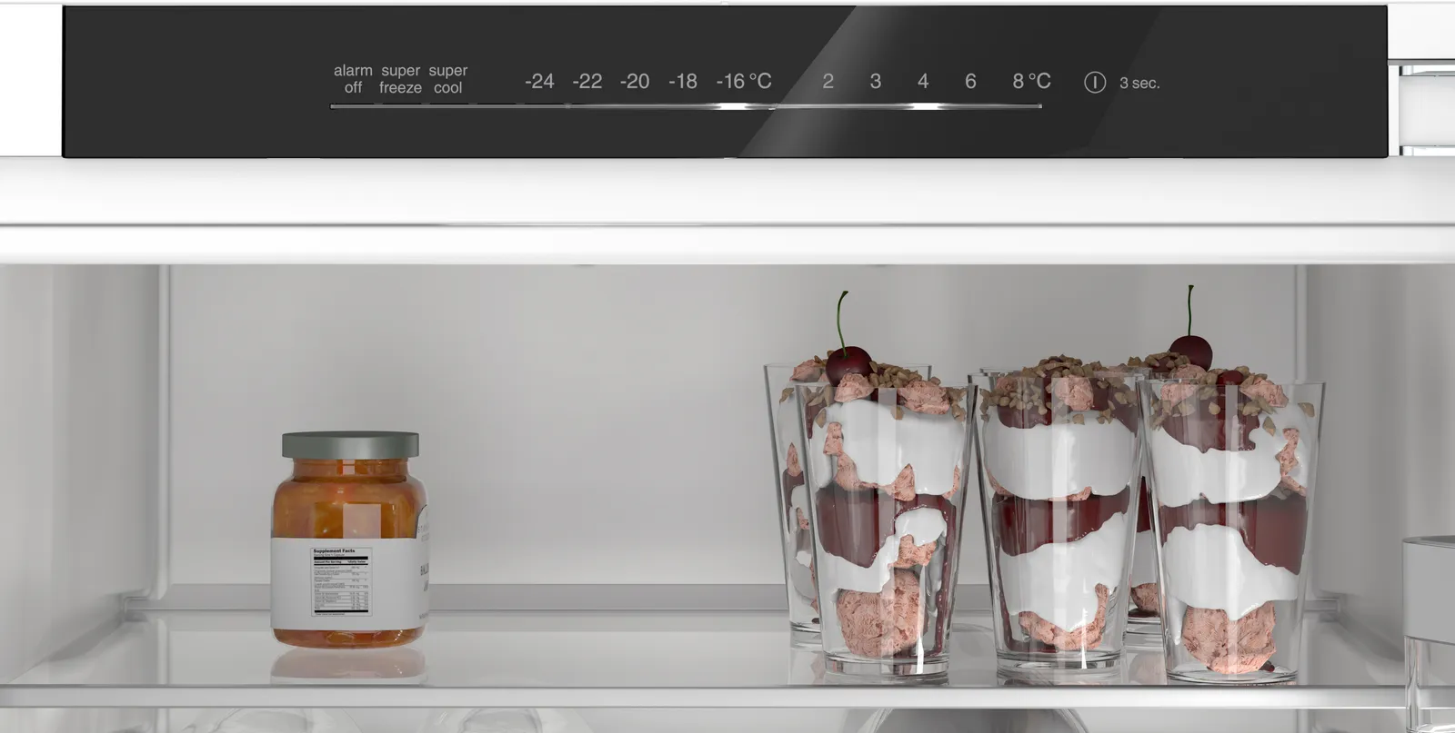 Bosch KIN96VFD0 — вбудований холодильник серії 4 із нижньою морозильною камерою та збільшеною місткістю завдяки вищій конструкції, що забезпечує близько 11% додаткового простору без збільшення площі кухні. Система VitaFresh XXL підтримує оптимальні умови зберігання: зона з температурою близько 0 °C призначена для м’яса та риби, а окреме відділення з контрольованим мікрокліматом допомагає довше зберігати свіжість фруктів і овочів. Технологія EcoAirflow рівномірно розподіляє повітря всередині, підтримуючи стабільну температуру й вологість, що сприяє довшому зберіганню продуктів.