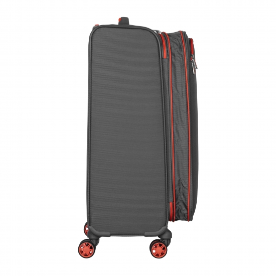 Для комфортного переміщення валізу оснащено чотирма подвійними колесами-спінерами, які обертаються на 360°, забезпечуючи плавний і безшумний рух чи не будь-якою поверхнею. Телескопічне алюмінієве руків’я із фіксацією в трьох положеннях надає змогу налаштувати комфортну висоту відповідно до зросту користувача. На фронтальній поверхні розміщено зовнішню кишеню на блискавці – практичне рішення для зберігання документів, квитків або речей, які мають бути напохваті.