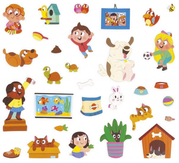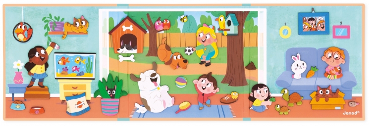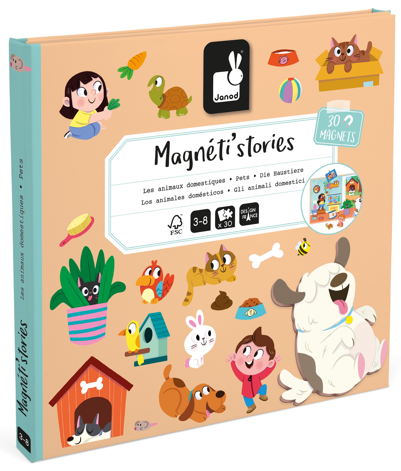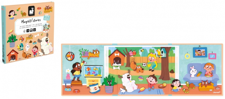 Janod Magneti'stories Pets J05457 — це магнітна книжка-іграшка з тематикою домашніх тварин, що містить ілюстровану магнітну дошку й 30 кольорових магнітів. Призначена для дітей від 3 років.