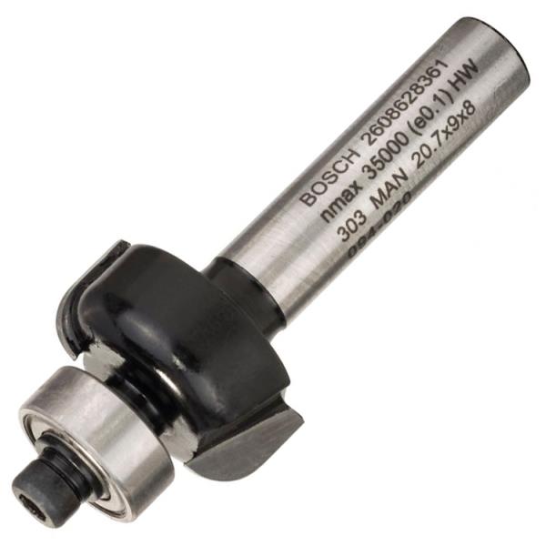 Фреза має хвостовик 8 мм, діаметр 20,7 мм, робочу довжину 9 мм і загальну — 53 мм. Радіус 4 мм дозволяє виконувати плавні переходи між елементами профілю. Твердосплавні ріжучі кромки гарантують стійкість до зношення, а шарикопідшипник забезпечує точне ведення інструмента без застосування шаблонів.