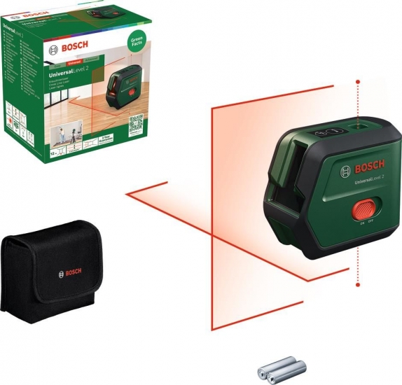 У комплект входить лазерний нівелір Bosch UniversalLevel 2, захисний чохол для зберігання, дві батареї типу AA 1,5 В та інструкція з експлуатації.
