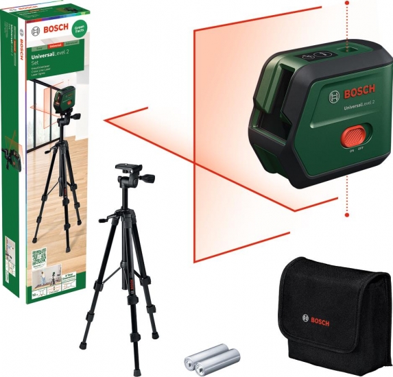 У комплект входить лазерний нівелір Bosch UniversalLevel 2, захисний чохол для зберігання, дві батареї типу AA 1,5 В, штатив ТТ 120 для стабільної фіксації пристрою та інструкція з експлуатації.