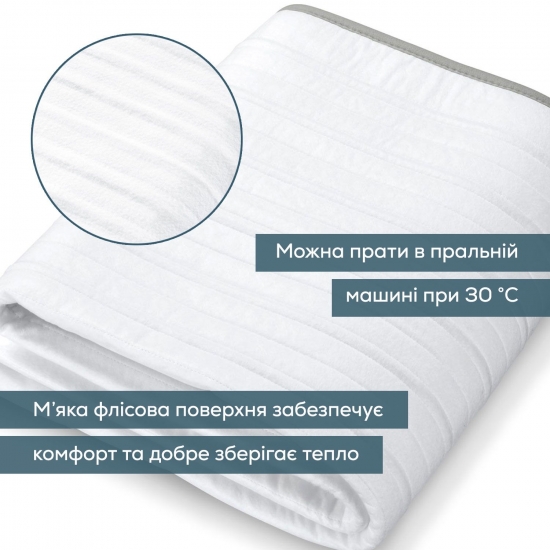 Еластичні ремінці фіксують простирадло на матраці, запобігаючи зісковзуванню. Знімний перемикач із підсвічуванням спрощує керування навіть у темряві. Після від’єднання контролера простирадло можна прати в пральній машині при 30 °C.