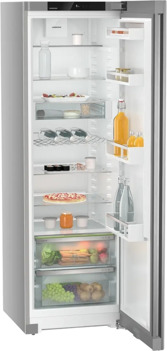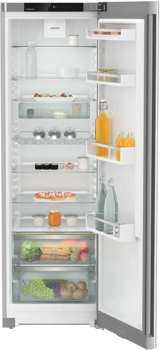 Внутрішній простір продуманий до дрібниць: сім скляних полиць, з яких шість можна регулювати по висоті, дверні полиці різної місткості та дві великі секції для овочів.