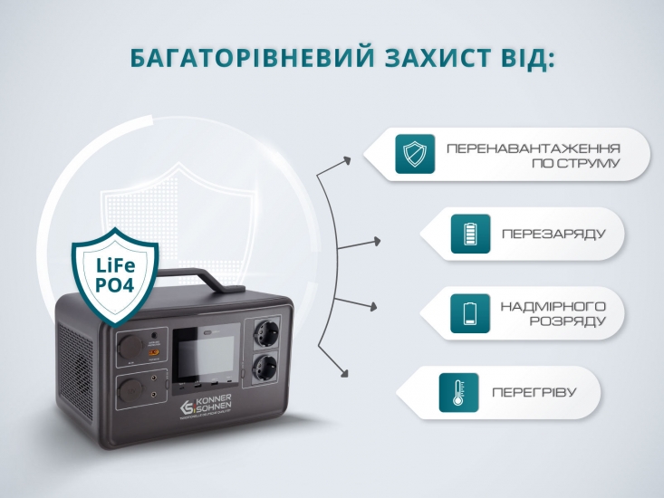 Багаторівневий захист від: перевантаження струмом, перезарядження, надмірного розряду, перегріву.