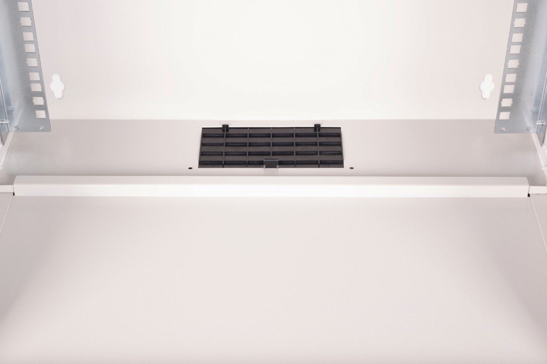 Настінна шафа DIGITUS 19” 9U SOHO PRO створена для організованого монтажу мережевих компонентів у приміщеннях з обмеженим простором. Конструкція виготовлена зі сталевих панелей зі стійким порошковим покриттям, а суцільні скляні дверцята забезпечують кут відкриття 200°. Усередині розташовані оцинковані 19-дюймові рейки з регулюванням по глибині, що дає змогу адаптувати внутрішній простір під різні типи обладнання. Кабельні вводи у стелі та основі з пластиковими кришками забезпечують акуратне прокладання проводки, а вентиляційні отвори підтримують стабільний повітрообмін. Модель постачається у розібраному стані, а складання виконується у кілька простих кроків.