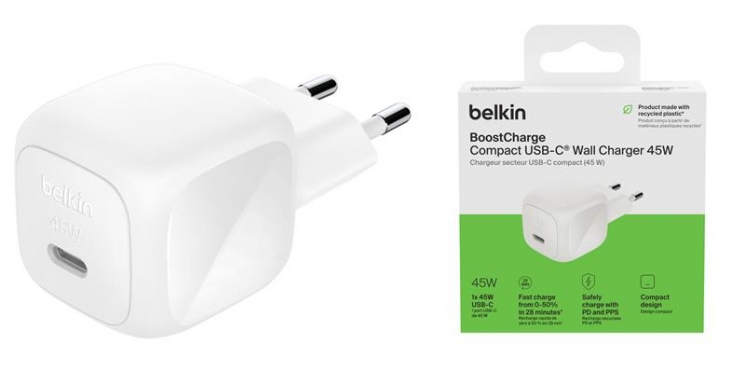 Зарядний пристрій Belkin 45 Вт пропонує поєднання високої продуктивності та компактного формату. Він оснащений портом USB-C PD 3.1 та застосовує інтелектуальне регулювання живлення завдяки технології PPS. Кубічна форма корпусу робить пристрій зручним у транспортуванні, а широкий діапазон вихідних напруг дозволяє заряджати різні типи техніки. Підходить для використання вдома, у подорожах або на роботі.