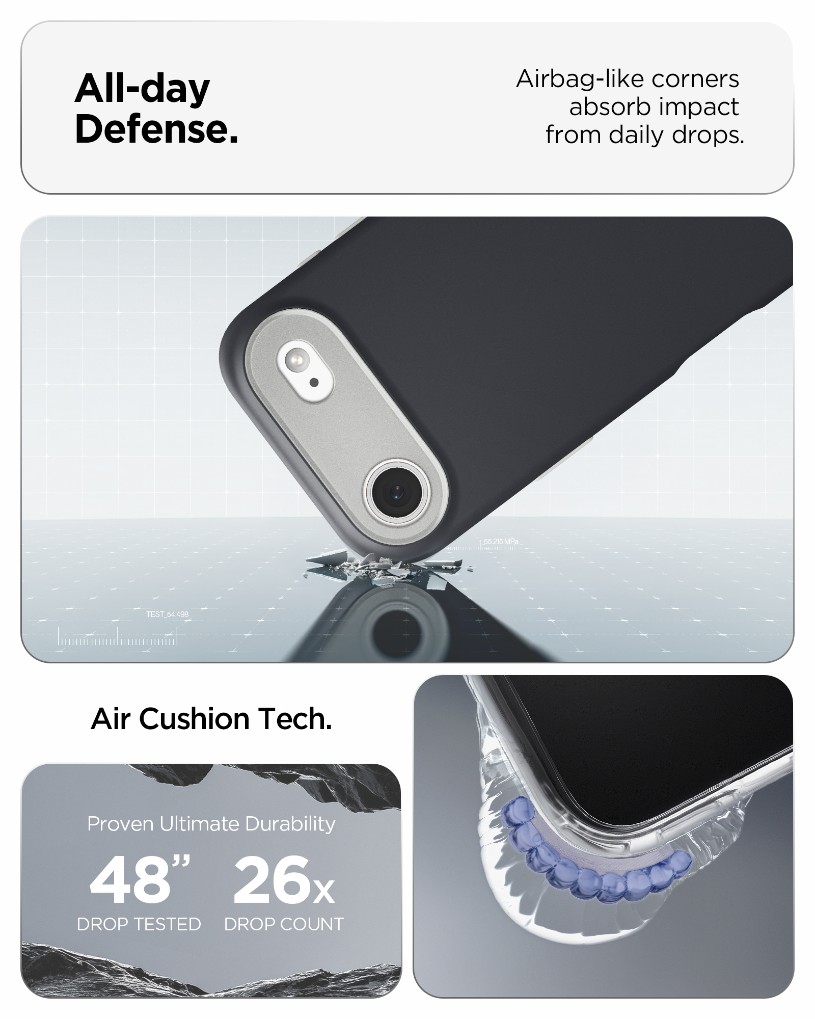Конструкція чохла складається з міцного полікарбонату (PC) та еластичного TPU, які формують надійний захисний корпус. Фірмова технологія Air Cushion у кутах ефективно поглинає удари, захищаючи iPhone 17 Air від падінь.