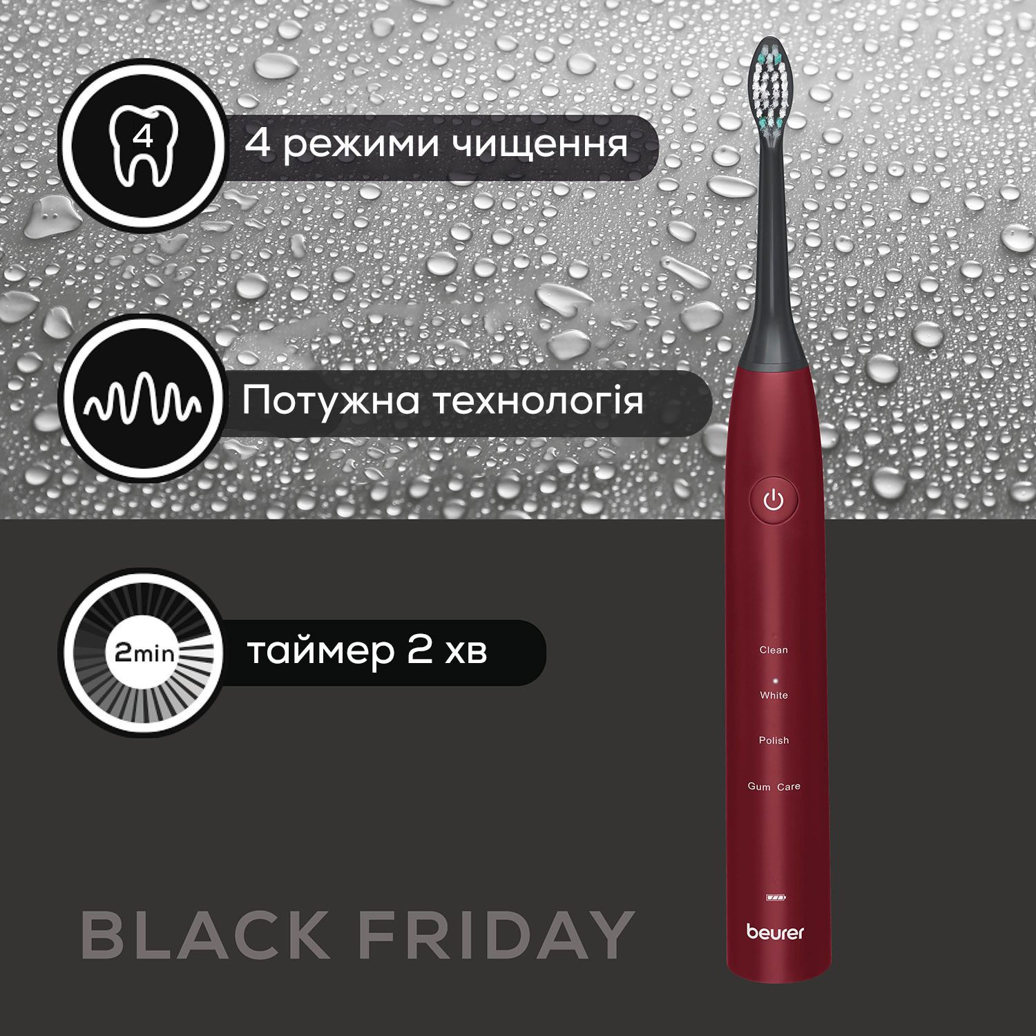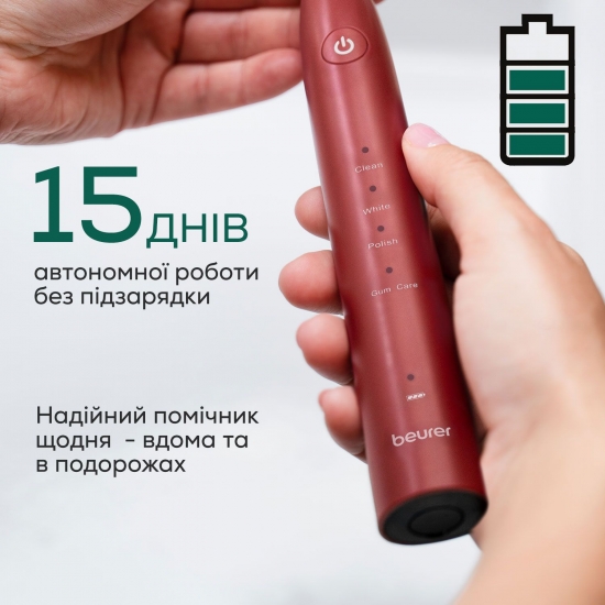 Beurer SC 30 Ripe Cherry поєднує звукову технологію, продумані режими чищення, зручне USB-C заряджання та візуальний контроль стану насадок, створюючи комфортні умови для регулярної гігієни ротової порожнини.