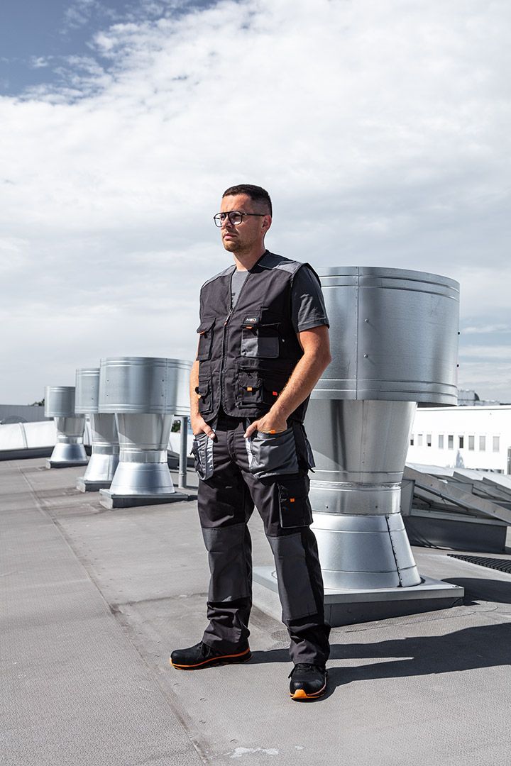 Робочі кросівки Neo Tools 82-155-46 — зручне взуття для промислових робіт у чорно-помаранчевому кольорі з розміром 46 (30.7 см), що поєднує захист і вентиляцію відповідно до стандартів безпеки.