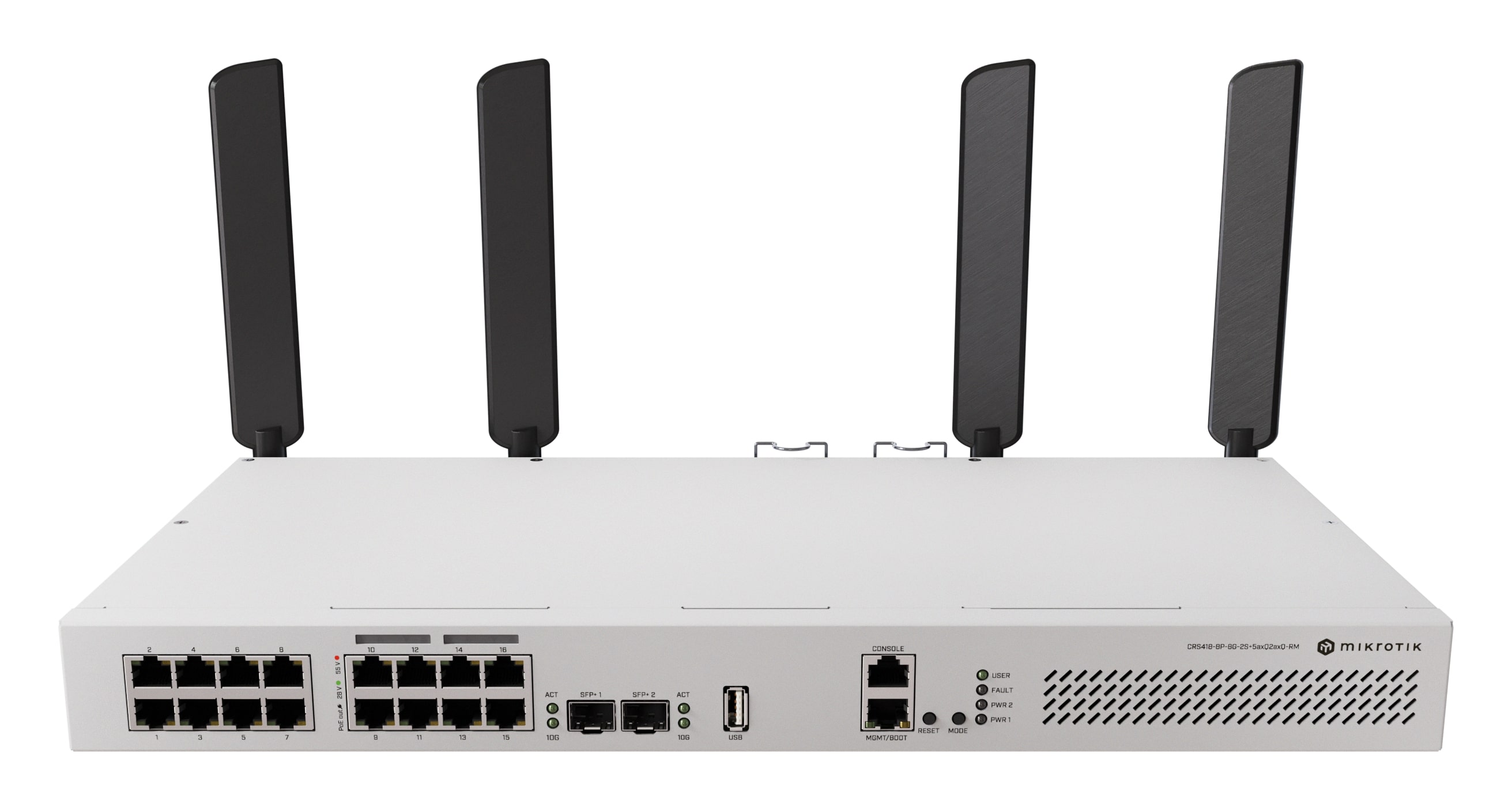 MikroTik CRS418-8P-8G-2S+5axQ2axQ-RM — це потужний комутатор із вбудованим Wi-Fi 6 (4×4 MIMO) та функціями маршрутизатора в одному корпусі 1U. Пристрій має 16 гігабітних Ethernet-портів (8 із PoE-out), 2 порти 10G SFP+, чотириядерний процесор ARM 2.2 ГГц та апаратне прискорення L3. Завдяки USB 3.0 та можливості виносу антен це універсальний центр мережі для офісу чи серверної кімнати.