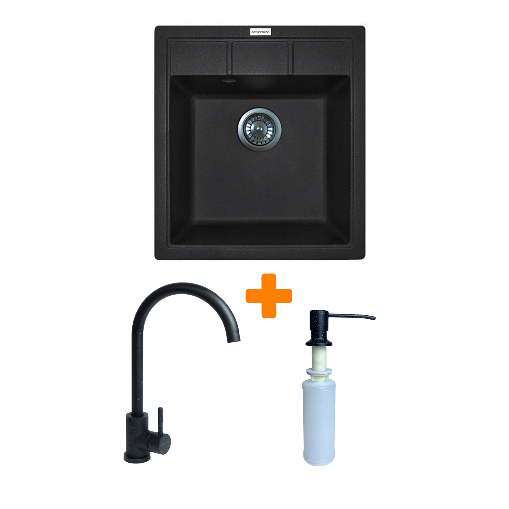 Набор кухонный Adamant Brick, искусственный камень, квадрат, без крыла, 460x515x200мм, чаша - 1, врезная, черный + смеситель и дозатор